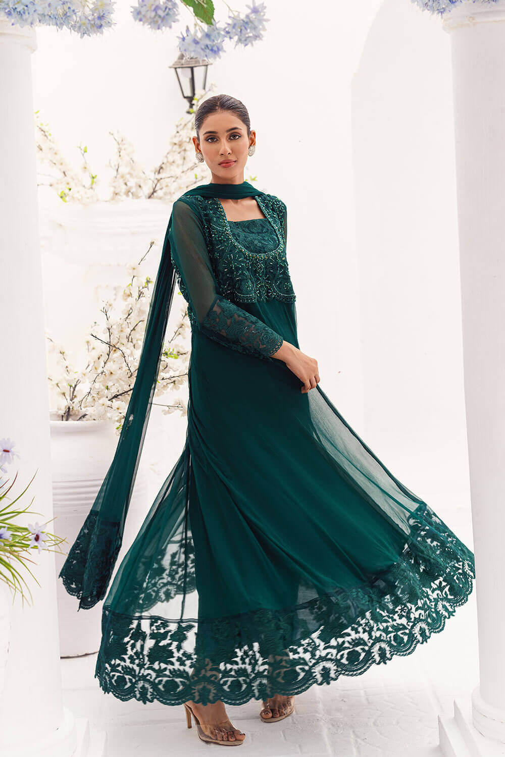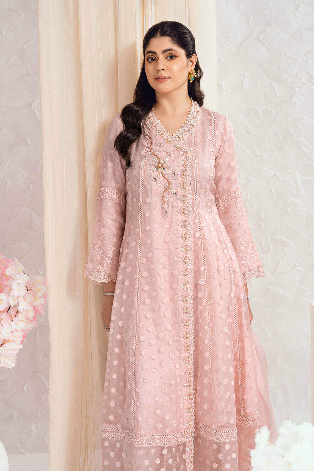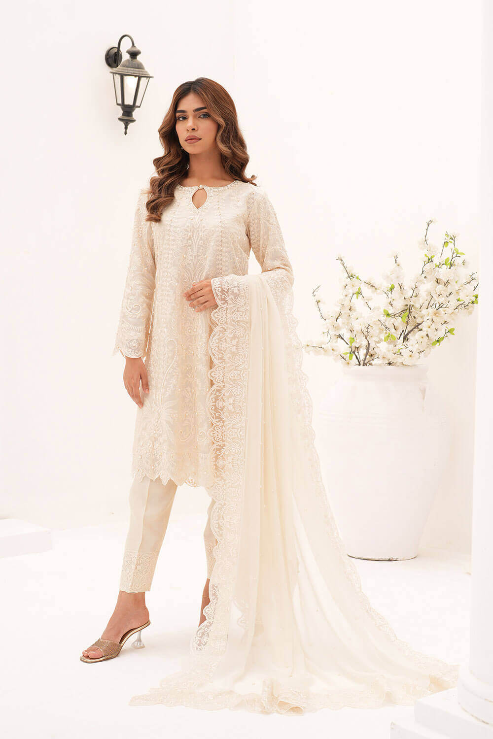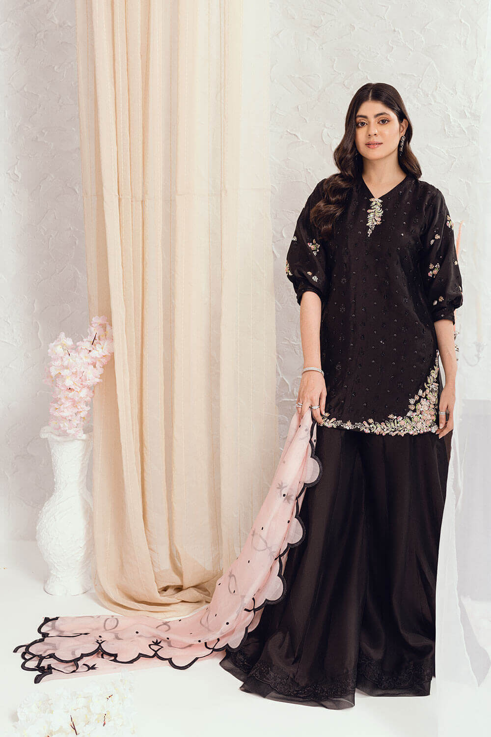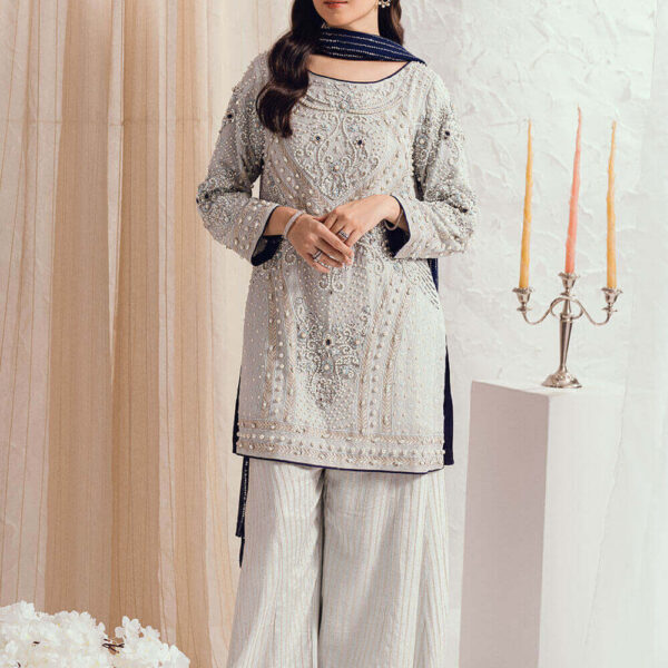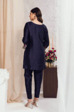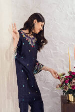 Clara’s navy blue silk tunic is brought to life with intricate multi-coloured thread work. Paired with sleek cigarette pants, this hand-embroidered piece adds a fresh, vibrant touch to your wardrobe.