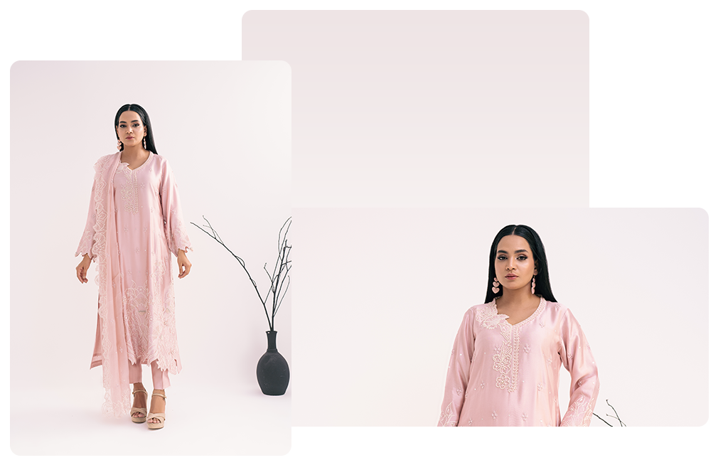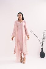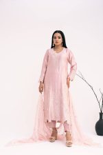 This tea pink silk suit is pure magic! The shirt is soft as a cloud with beautiful ivory embroidery and delicate handwork. The pants are smooth and comfy, while the organza dupatta is light and airy with stunning hand-embroidered details. You’ll adore it