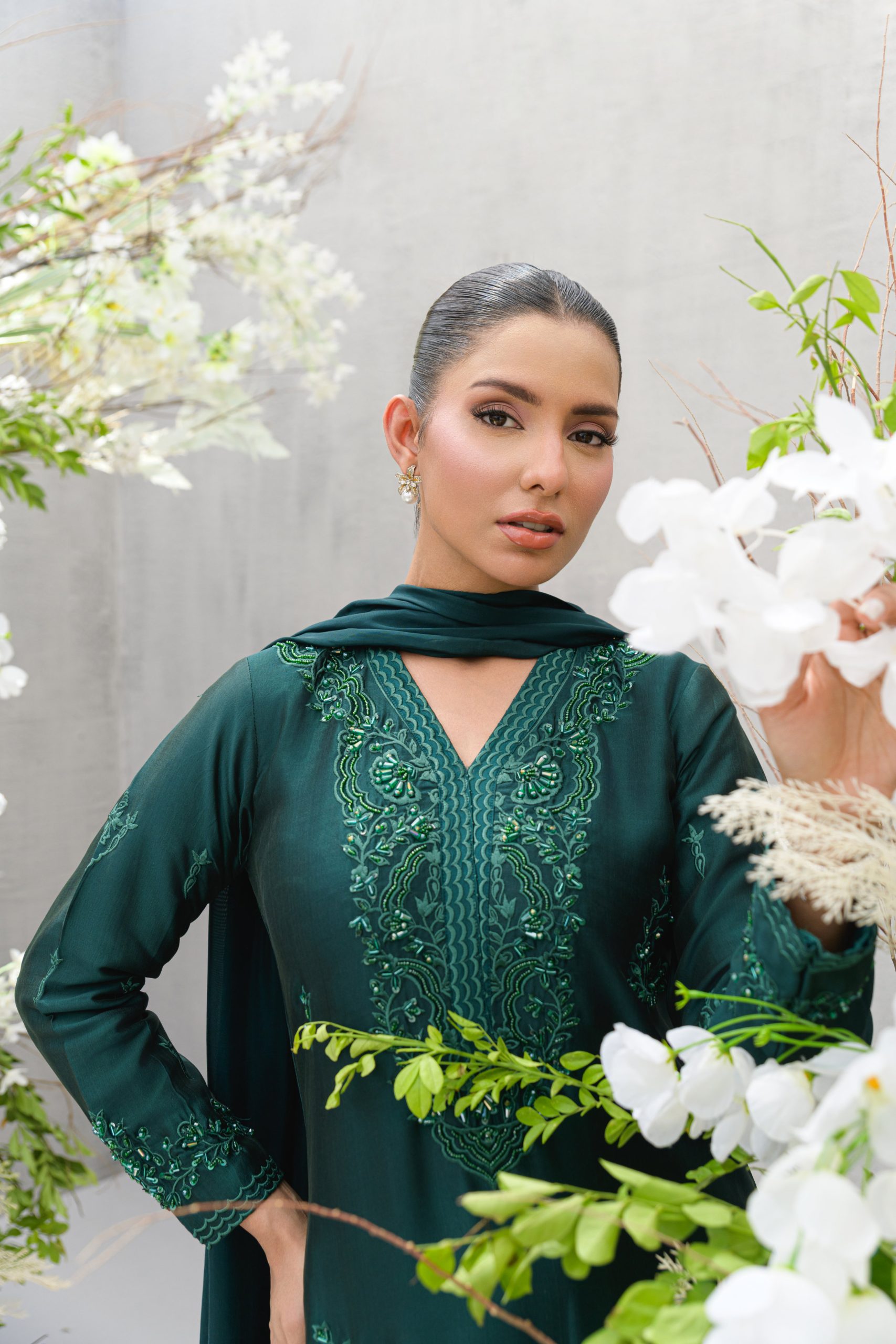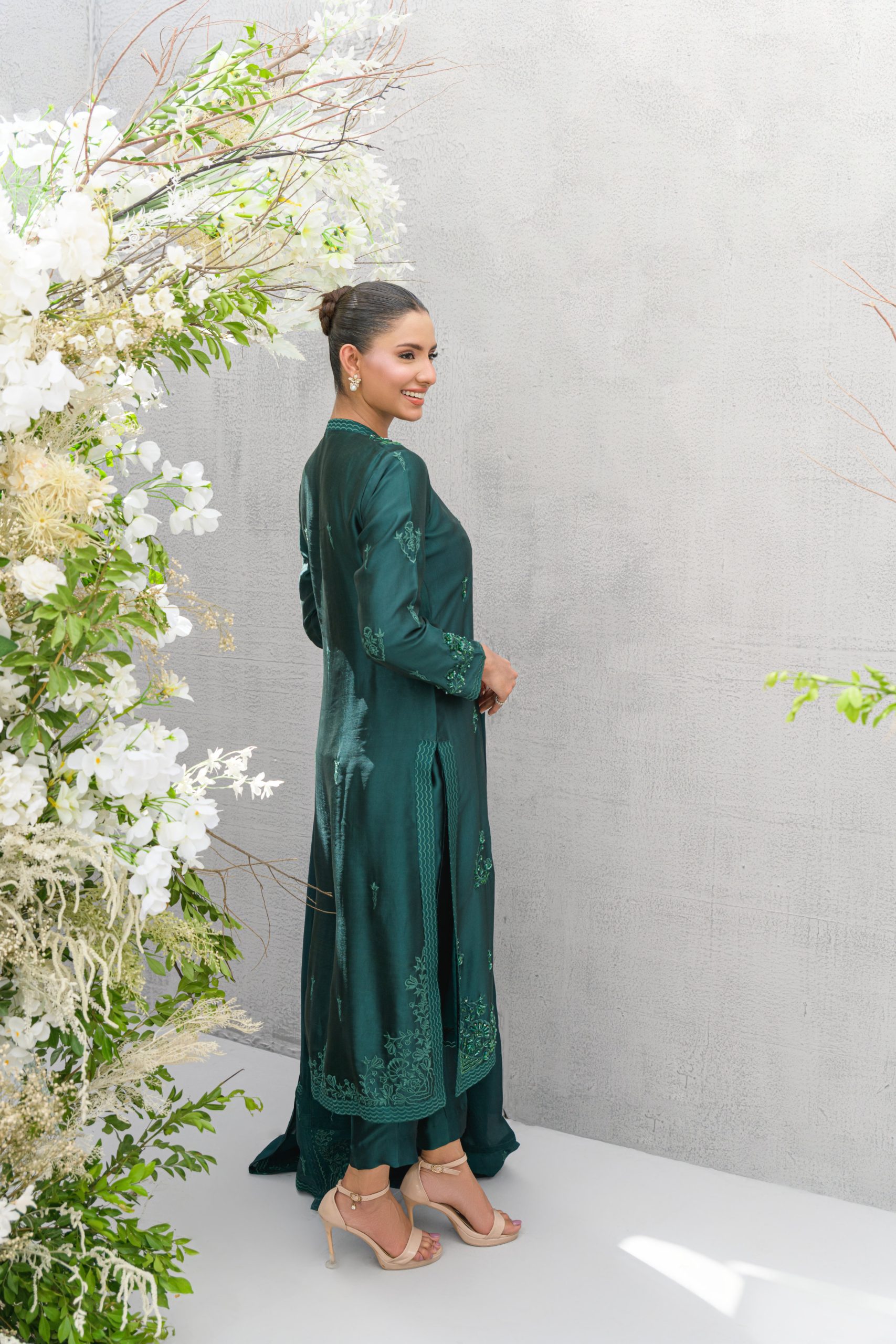 A Jade Green A-line shirt with a touch of hand embroidery on delicate machine embroidery. This formal piece is perfect for the festive season.