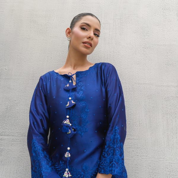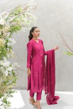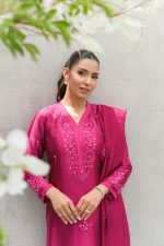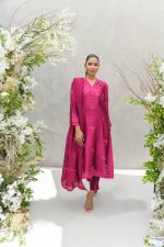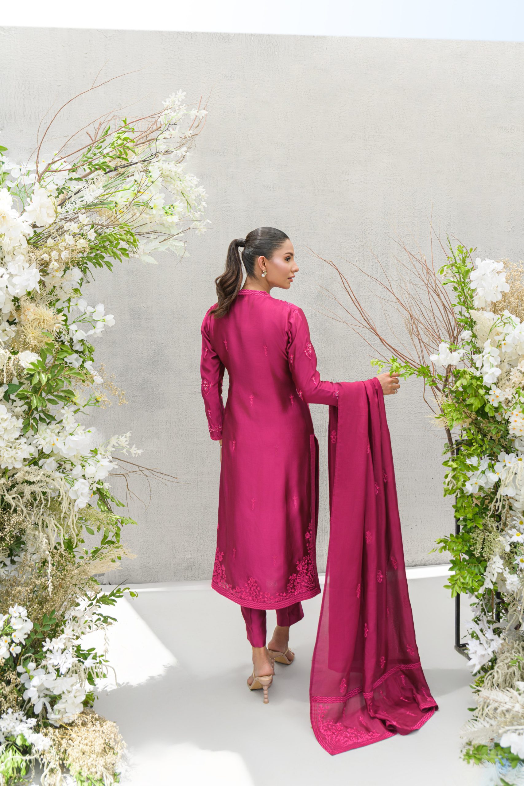 A Magenta Pink A-line shirt with a touch of hand embroidery on delicate machine embroidery. This formal piece is perfect for this festive season.