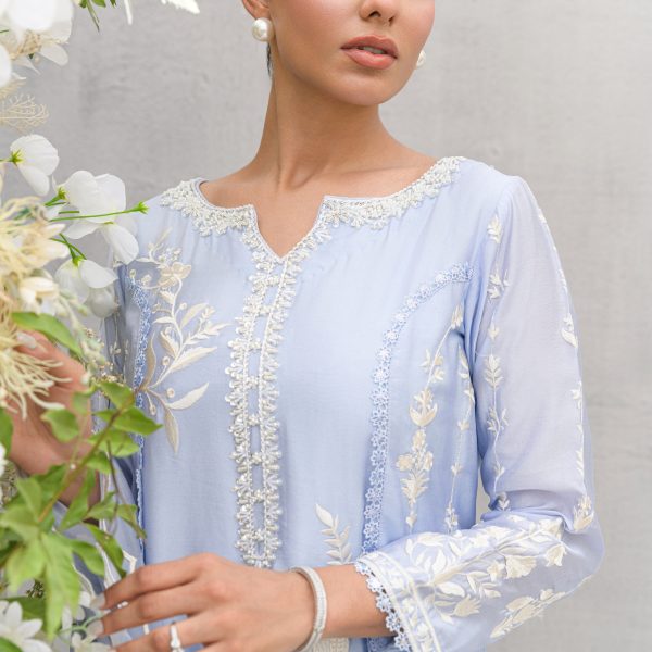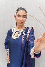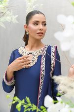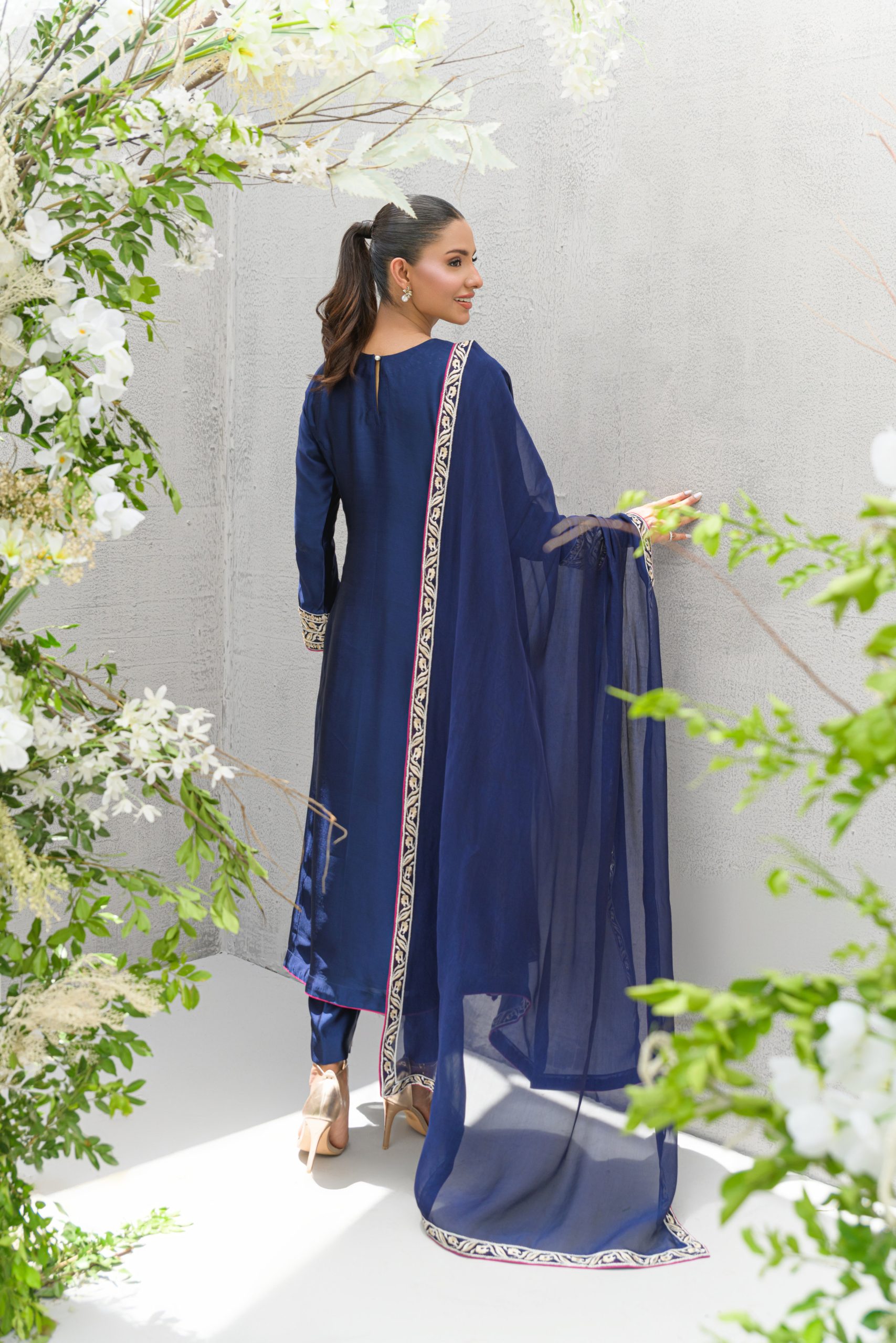 A navy blue A-line shirt with a touch of hand embroidery on delicate machine embroidery with hues of ivory and gold. This formal piece offers a refined, luxurious touch that’s perfect for making a statement wherever you go.