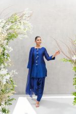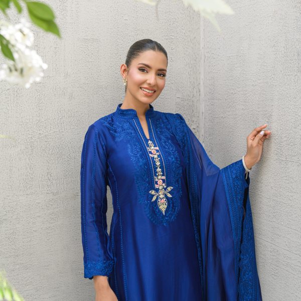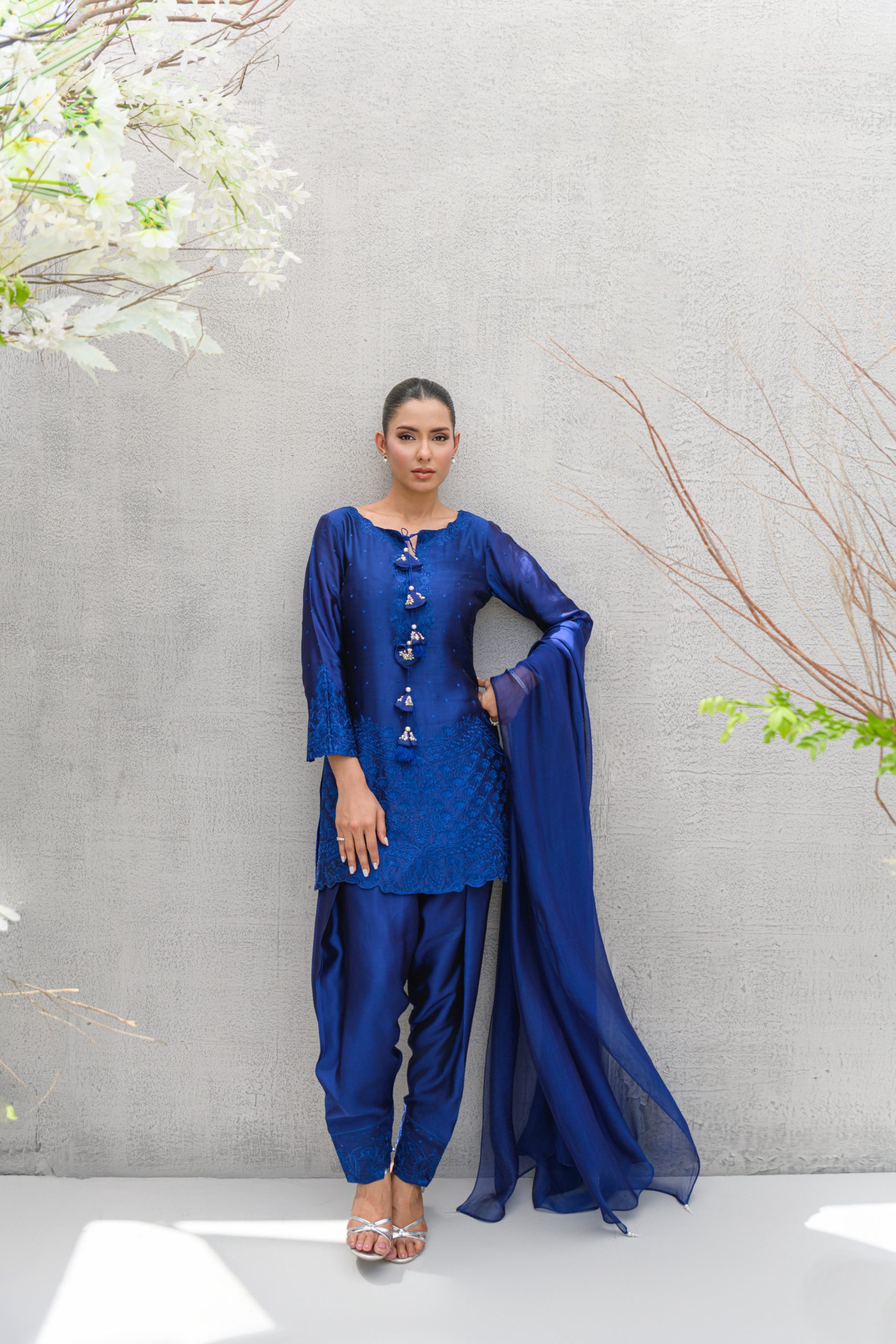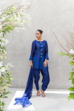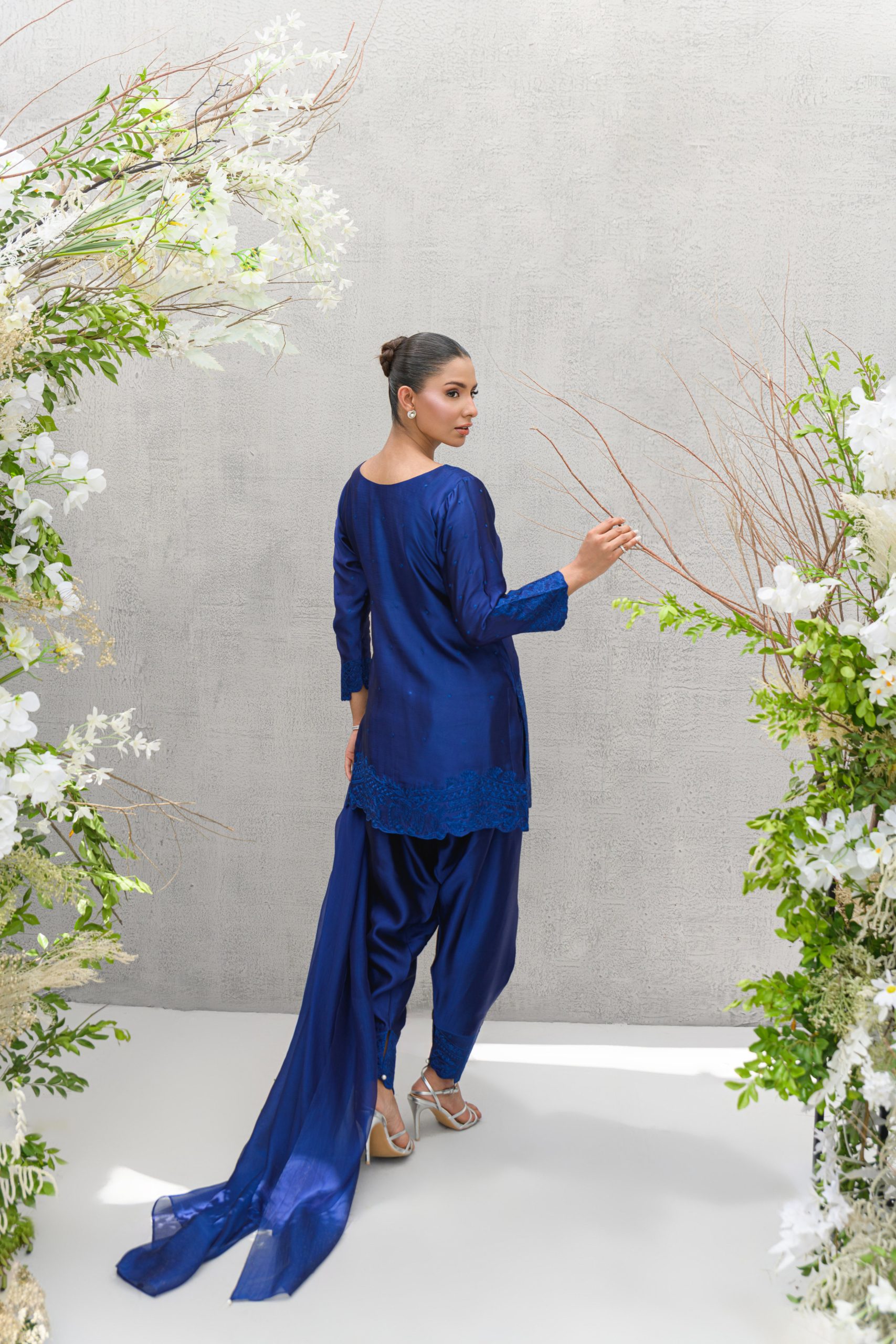 A Royale Blue straight shirt with a touch of hand embroidery on delicate machine embroidery. This formal piece is perfect for this festive season.