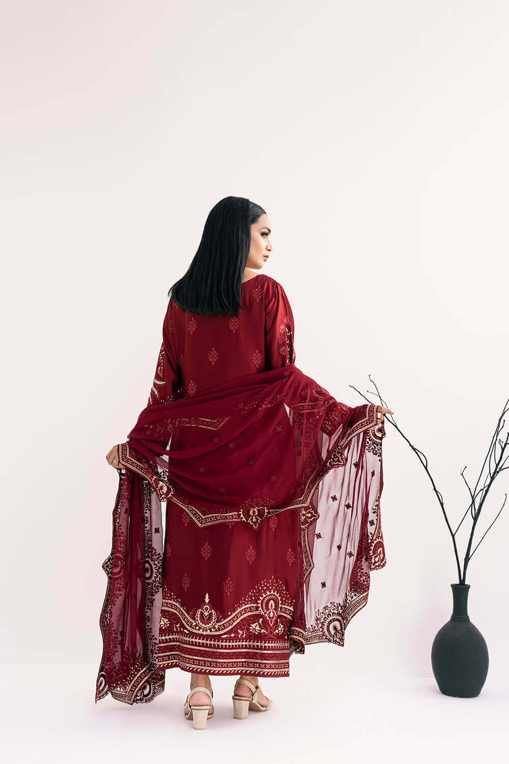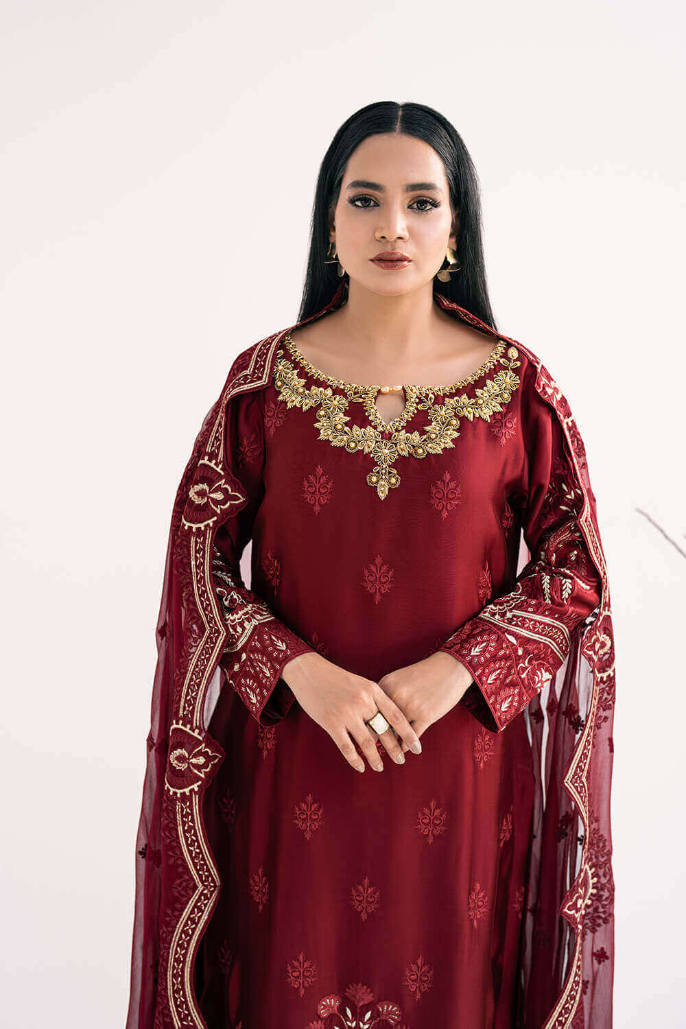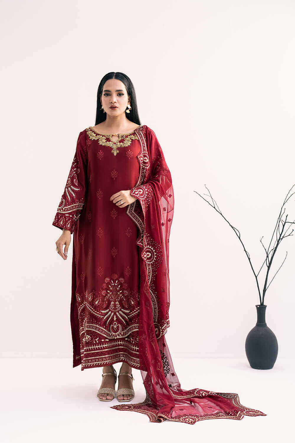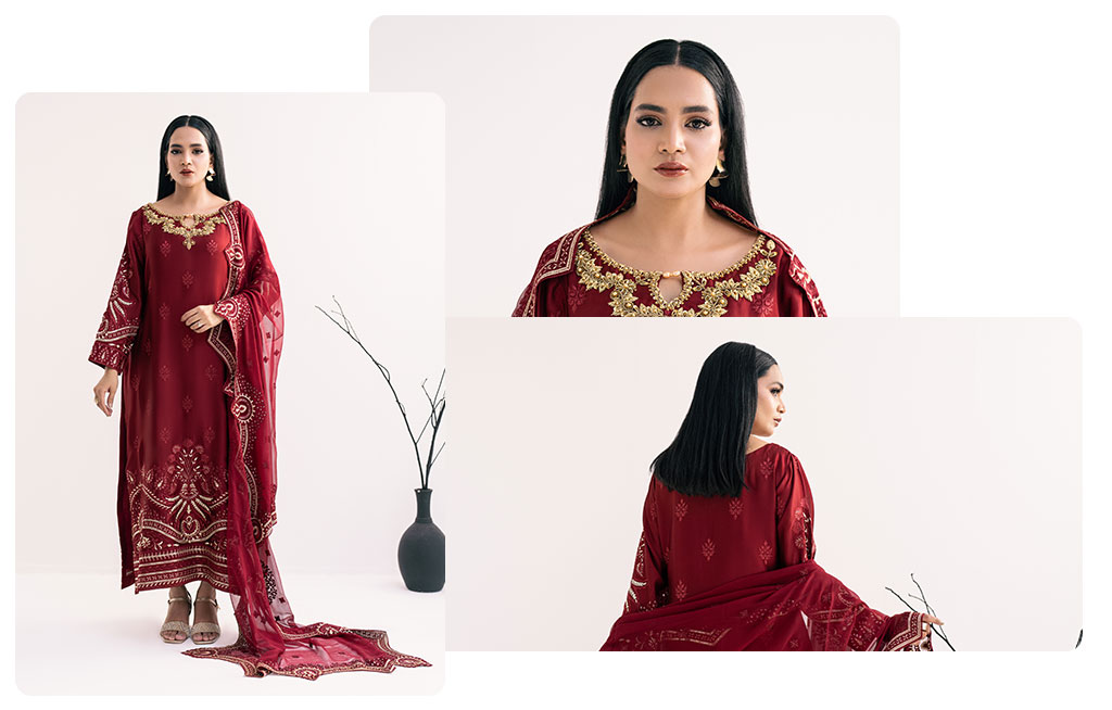 This lovely maroon dress is a perfect blend of elegance and comfort. The pure silk shirt features a beautiful hand-embroidered neckline. Paired with pure silk cigarette pants, it offers a sleek and stylish look. The outfit is completed with a pure chiffon embroidered dupatta, adding a touch of grace to your ensemble. Perfect for any special occasion, this outfit ensures you stand out with its exquisite craftsmanship.