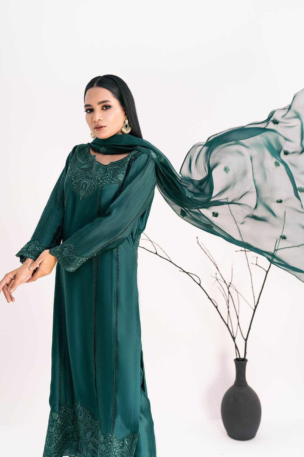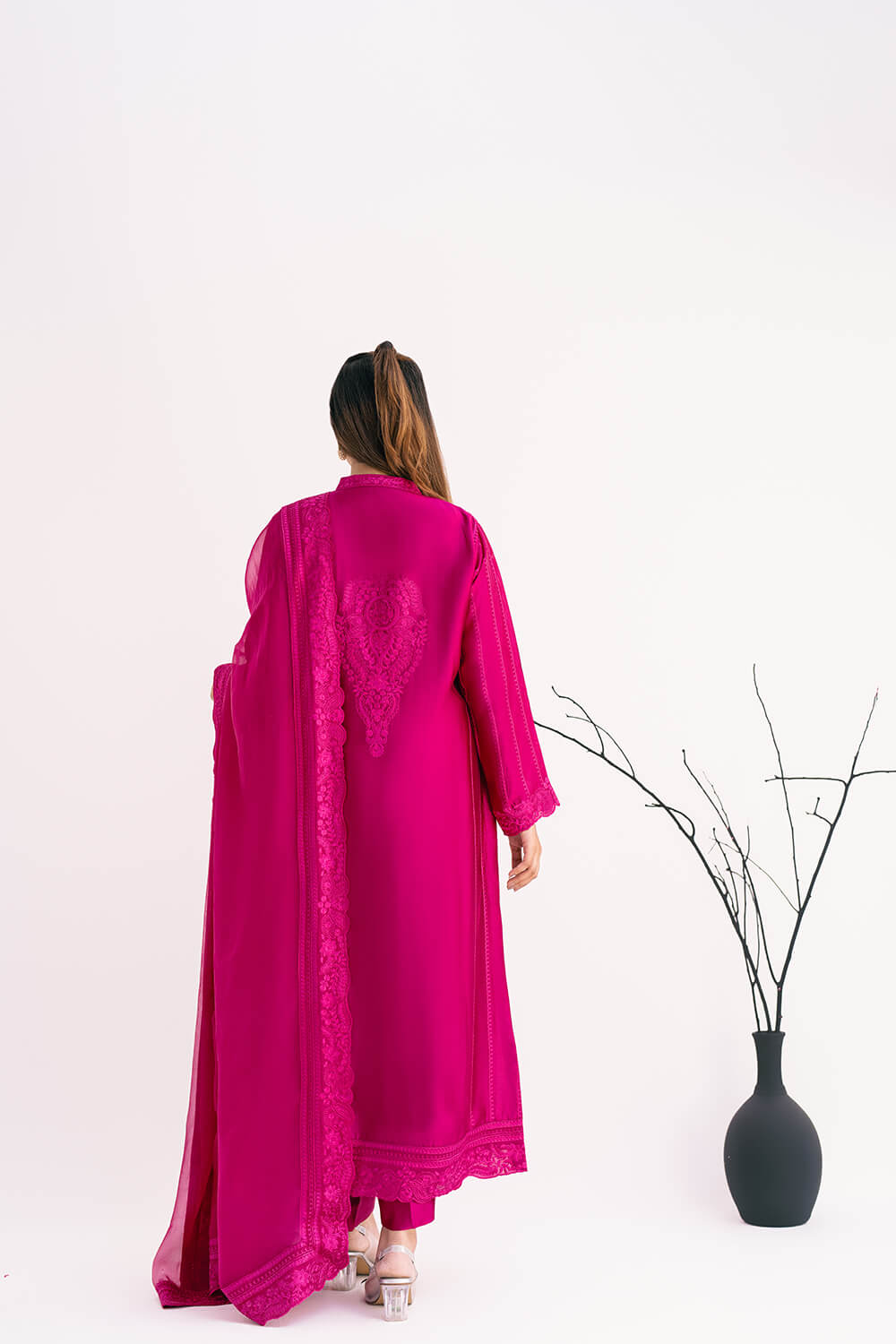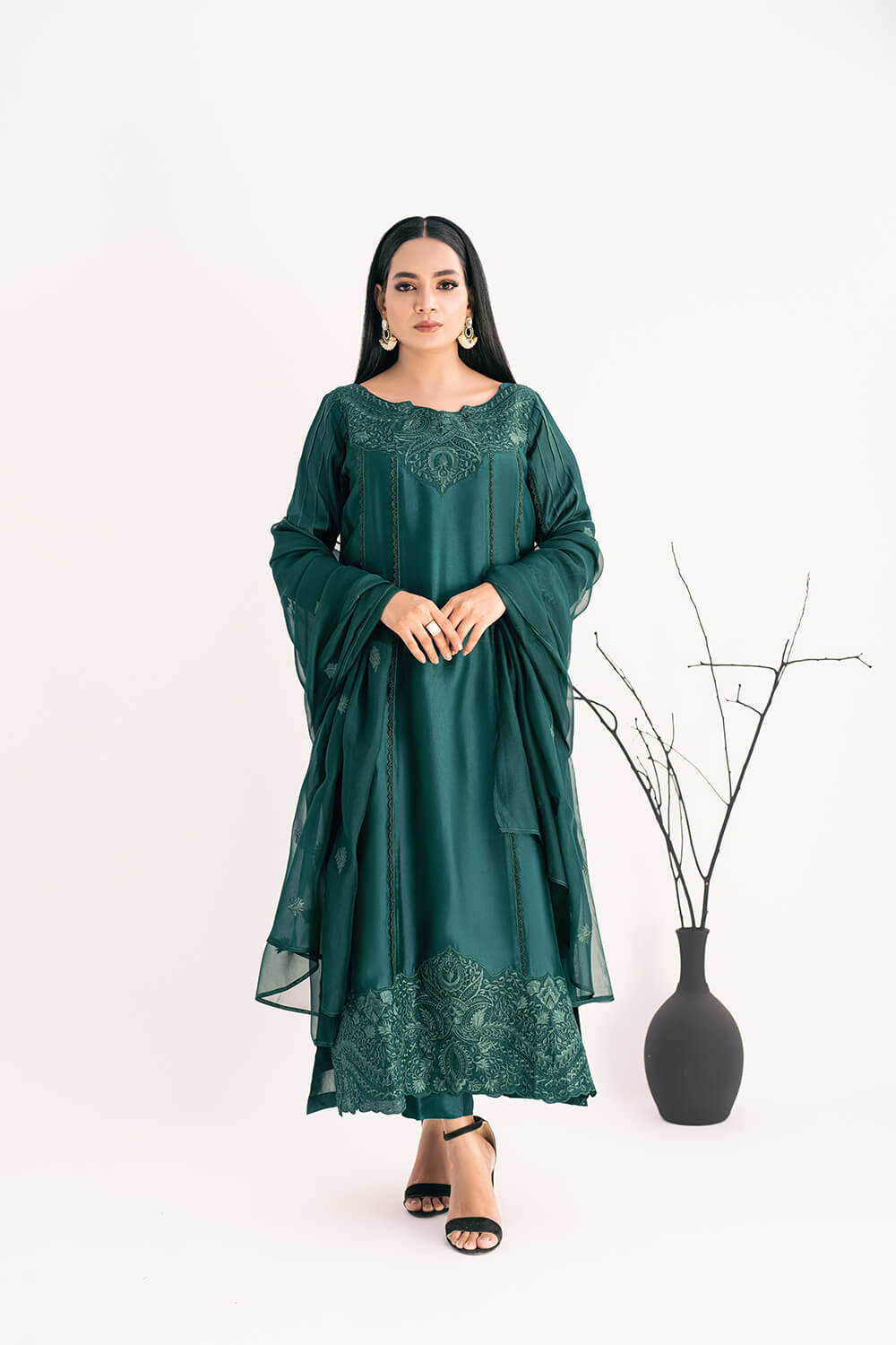 This lovely maroon dress is a perfect blend of elegance and comfort. The pure silk shirt features a beautiful hand-embroidered neckline. Paired with pure silk cigarette pants, it offers a sleek and stylish look. The outfit is completed with a pure chiffon embroidered dupatta, adding a touch of grace to your ensemble. Perfect for any special occasion, this outfit ensures you stand out with its exquisite craftsmanship.