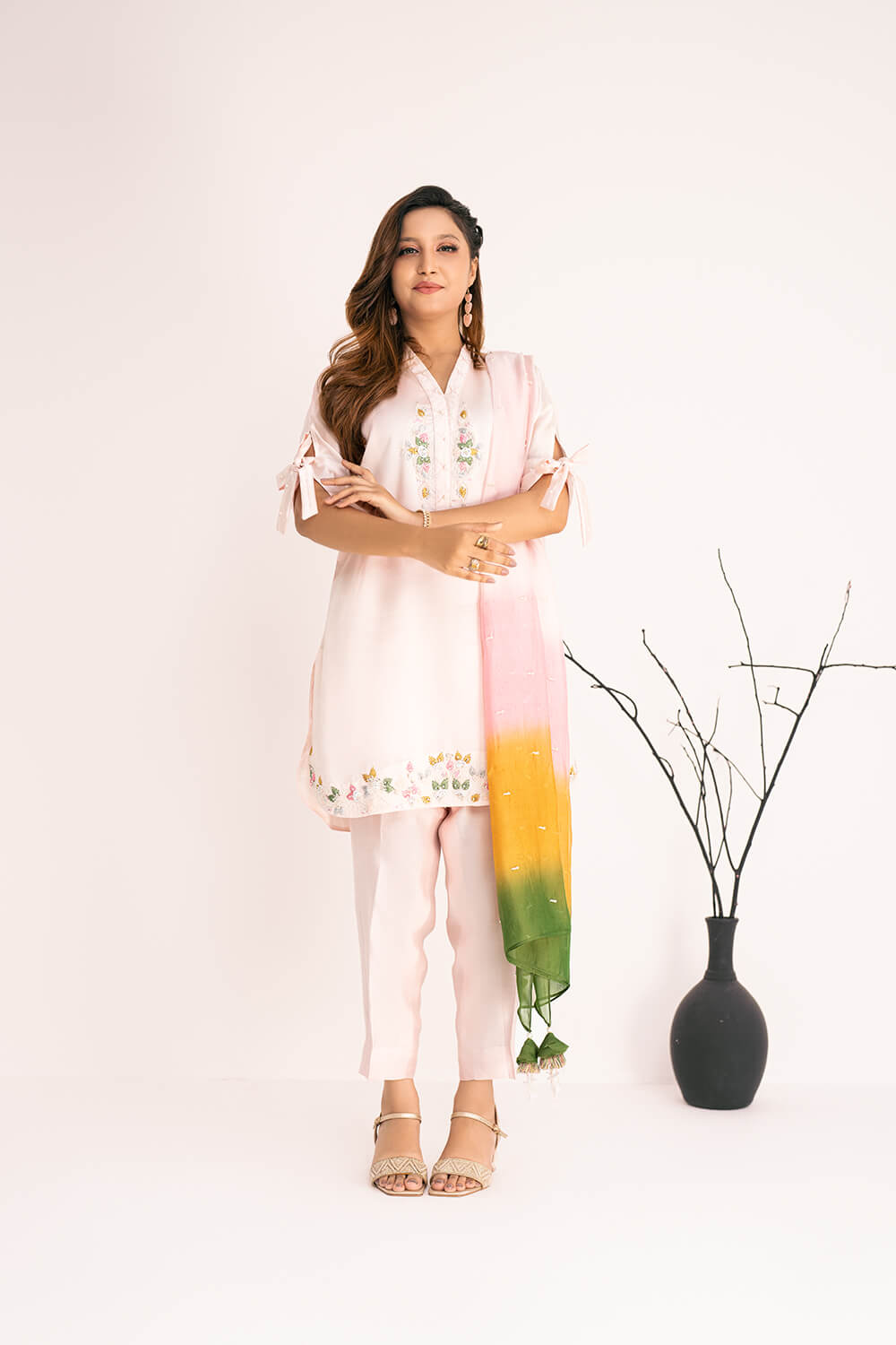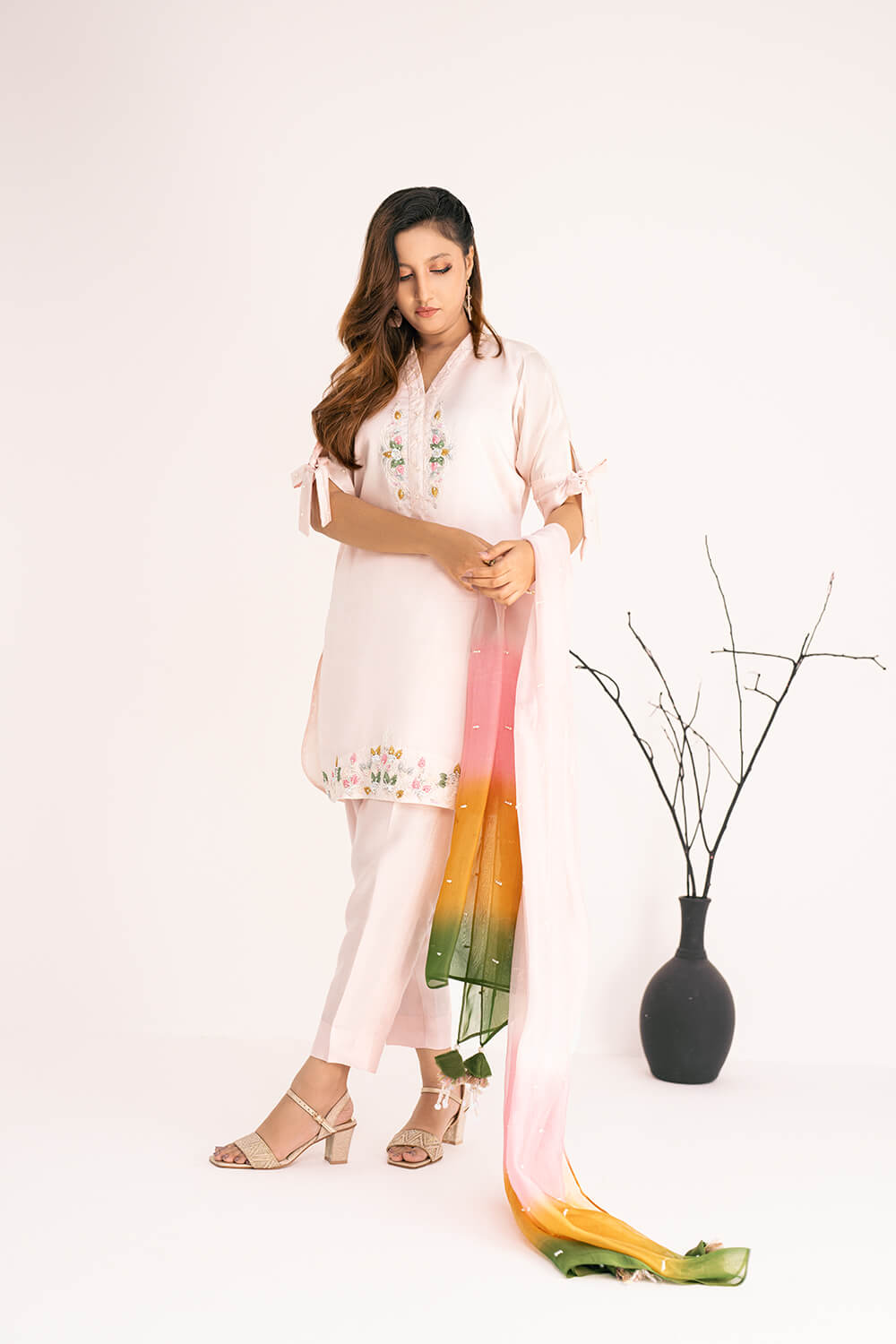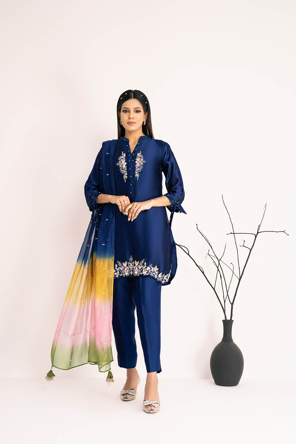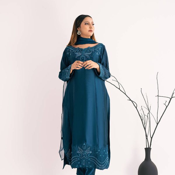 | Shirt: | Pure Silk Embroidered Shirt With Hand Embroidered Neck Line |
