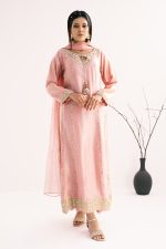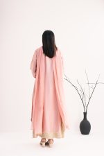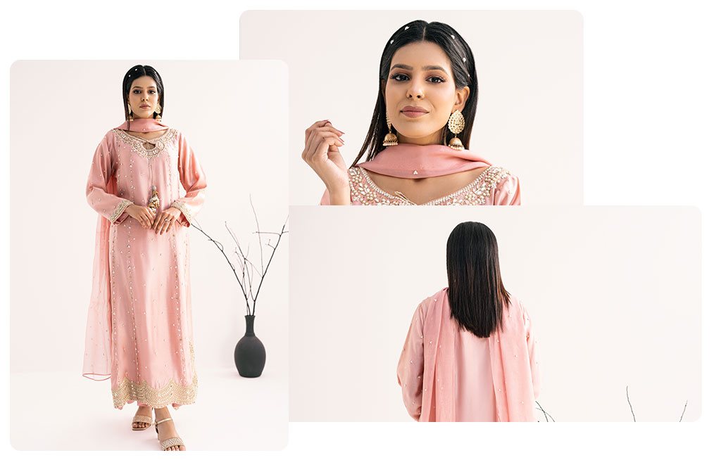 Sweet as a rose petal, our tea pink silk suit is pure magic! The shirt is like a dream, with the prettiest handwork and lace you’ve ever seen. he pants are soft and comfy, and the dupatta is like a cloud with sparkly pearls. It’s like wearing a hug of pure luxury.