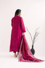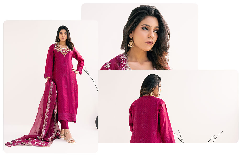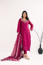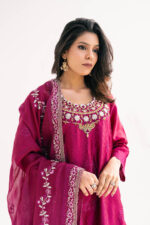 You’ll fall in love with this Magenta Self Silk look! The silky tunic, with its hand-embroidered neckline, is simply enchanting. The sleek cigarette pants are as comfy as they are stylish, and the silk net dupatta with its delicate embroidery adds a touch of magic. It’s an outfit that’ll make you feel fabulous and brighten up any occasion!